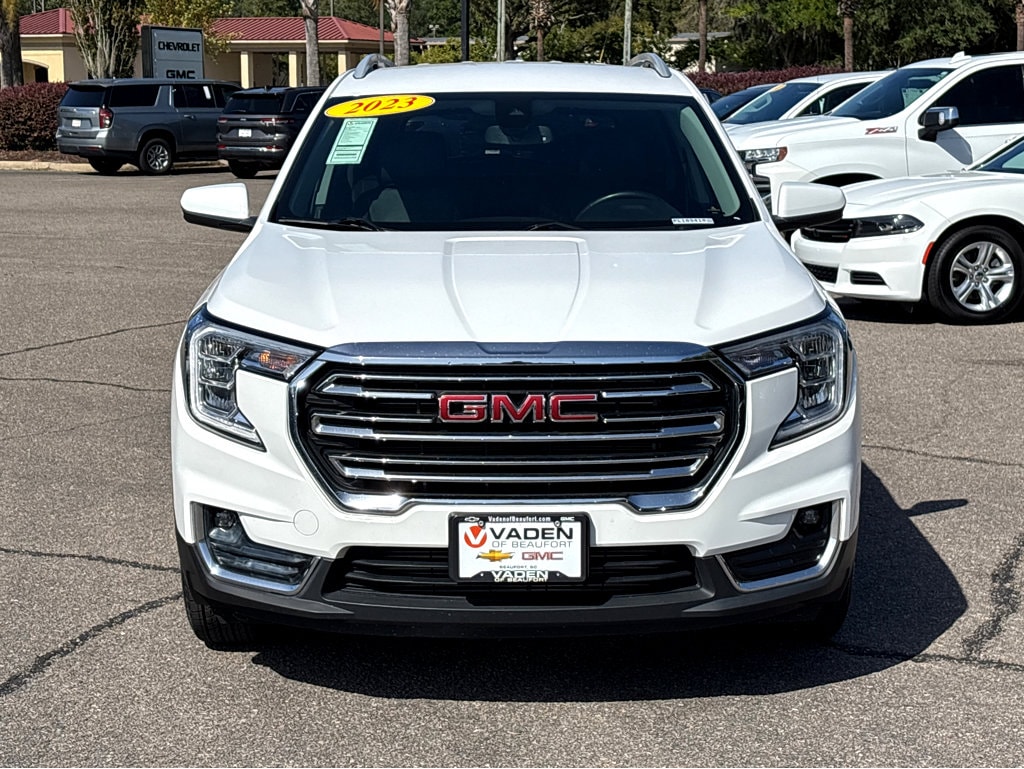 CARFAX One-Owner. Clean CARFAX. WWW.VADENOFBEAUFORT.COM, BLUETOOTH, REMOTE KEYLESS ENTRY, SOUND PACKAGE - SIRIUS XM SATELLITE RADIO, ONE OWNER, CLEAN CARFAX, EXTRA CLEAN, Adaptive Cruise Control, Preferred Equipment Group 4SA, Rear Park Assist, Safety Alert Seat, Terrain Pro Safety Plus.Vaden is pleased to offer this Summit White 2023 GMC Terrain SLT with Jet Black Leather... Beautifully equipped with Preferred Equipment Group 4SA, Terrain Pro Safety Plus (Adaptive Cruise Control, Rear Park Assist, and Safety Alert Seat), License Plate Front Mounting Package, 2 USB Data Ports, 2 USB Data Ports w/SD Card Reader, 3.47 Axle Ratio, 4-Wheel Disc Brakes, 6 Speakers, 6-Speaker Audio System Feature, 6-Way Power Front Passenger Seat, 8-Way Power Driver Seat Adjuster, ABS brakes, Air Conditioning, Alloy wheels, AM/FM radio: SiriusXM, Auto High-beam Headlights, Auto-dimming Rear-View mirror, Automatic temperature control, Bluetooth For Phone, Brake assist, Bumpers: body-color, Compass, Delay-off headlights, Deleted 3 Years of OnStar & Connected Services Plan, Driver & Front Passenger Heated Seats, Driver door bin, Driver vanity mirror, Dual front impact airbags, Dual front side impact airbags, Electronic Stability Control, Emergency communication system: OnStar and GMC connected services capable, Four wheel independent suspension, Front anti-roll bar, Front Bucket Seats, Front Center Armrest, Front dual zone A/C, Front fog lights, Front Passenger 2-Way Power Lumbar, Front reading lights, Fully automatic headlights, Garage door transmitter, Heated door mirrors, Heated front seats, Heated steering wheel, Illuminated entry, Low tire pressure warning, Memory seat, Occupant sensing airbag, Outside temperature display, Overhead airbag, Overhead console, Panic alarm, Passenger door bin, Passenger vanity mirror, Perforated Leather-Appointed Seat Trim, Power door mirrors, Power Driver Lumbar Control, Power driver seat, Power Liftgate, Power passenger seat, Power steering, Power windows, Radio data system, Radio: GMC Infotainment Audio System w/8' Display, Rear anti-roll bar, Rear seat center armrest, Rear window defroster, Rear window wiper, Remote keyless entry, Roof rack: rails only, Security system, SiriusXM Radio, Speed control, Speed-sensing steering, Split folding rear seat, Spoiler, Steering wheel mounted audio controls, Tachometer, Telescoping steering wheel, Tilt steering wheel, Traction control, Trip computer, Turn signal indicator mirrors, Variably intermittent wipers, Wheels: 18' x 7' Silver Painted Aluminum, and Wireless Apple CarPlay/Wireless Android Auto!2023 GMC Terrain SLT