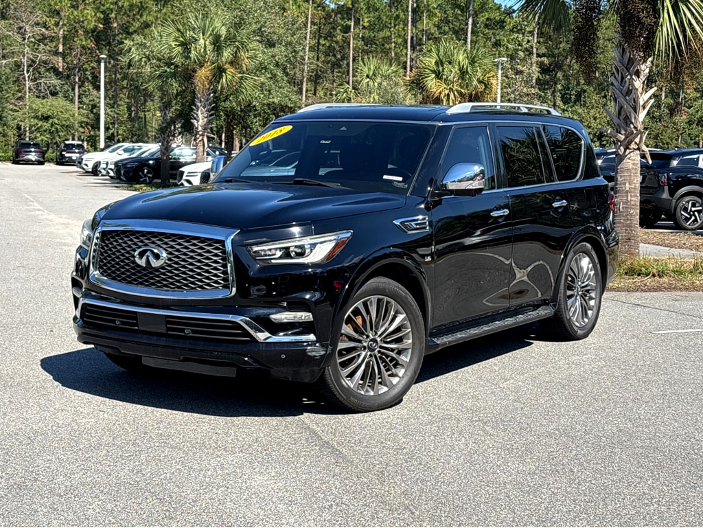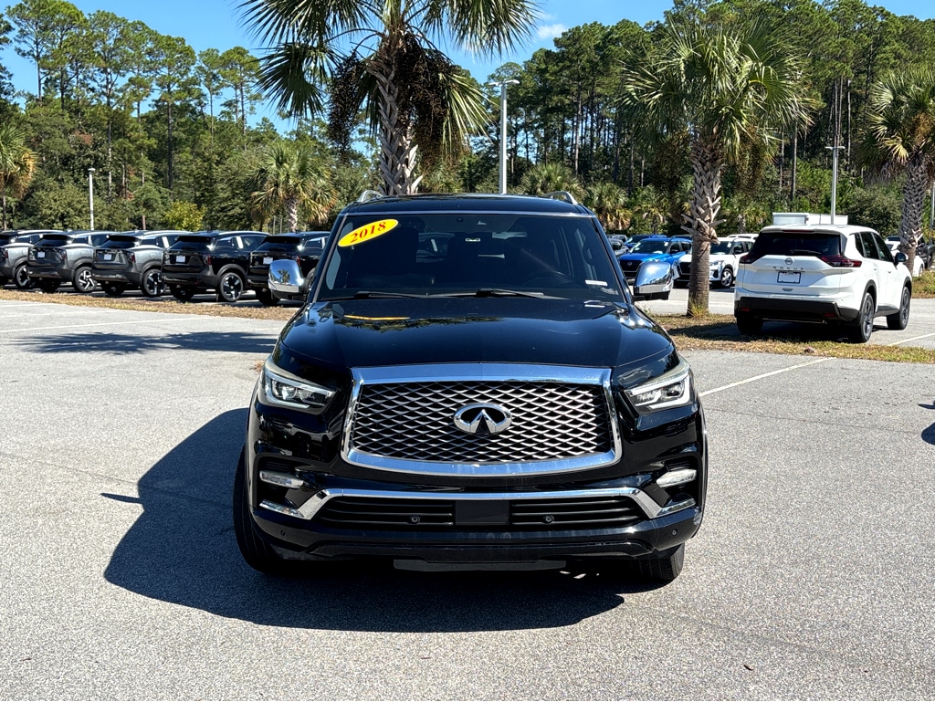 Vaden is pleased to offer 2018 INFINITI QX80 in Black, Beautifully equipped with all the essentials and then some! 13 Speakers, 2.94 Axle Ratio, 3rd row seats: split-bench, 4-Wheel Disc Brakes, ABS brakes, Air Conditioning, Alloy wheels, AM/FM radio: SiriusXM, Anti-whiplash front head restraints, Auto High-beam Headlights, Auto tilt-away steering wheel, Auto-dimming door mirrors, Auto-dimming Rear-View mirror, Auto-leveling suspension, Automatic temperature control, Brake assist, Bumpers: body-color, CD player, Delay-off headlights, Driver door bin, Driver vanity mirror, Dual front impact airbags, Dual front side impact airbags, Electronic Stability Control, Emergency communication system: INFINITI Connection, Four wheel independent suspension, Front anti-roll bar, Front Bucket Seats, Front Center Armrest, Front dual zone A/C, Front fog lights, Front reading lights, Fully automatic headlights, Garage door transmitter: HomeLink, Genuine wood console insert, Genuine wood dashboard insert, Genuine wood door panel insert, Heated door mirrors, Heated Front Bucket Seats, Heated front seats, Heated steering wheel, Illuminated entry, Leather Shift Knob, Leather steering wheel, Leather-Appointed Seats w/Stratford Burl Trim, Low tire pressure warning, Memory seat, Navigation System, Occupant sensing airbag, Outside temperature display, Overhead airbag, Overhead console, Panic alarm, Passenger door bin, Passenger vanity mirror, Power door mirrors, Power driver seat, Power Liftgate, Power moonroof, Power passenger seat, Power steering, Power windows, Radio data system, Radio: AM/FM/HD Single In-Dash CD/DVD Player w/MP3, Rain sensing wipers, Rear air conditioning, Rear anti-roll bar, Rear audio controls, Rear reading lights, Rear seat center armrest, Rear window defroster, Rear window wiper, Reclining 3rd row seat, Remote keyless entry, Roof rack: rails only, Security system, Speed control, Speed-sensing steering, Split folding rear seat, Spoiler, Steering wheel memory, Steering wheel mounted audio controls, Tachometer, Telescoping steering wheel, Tilt steering wheel, Traction control, Trip computer, Turn signal indicator mirrors, Variably intermittent wipers, Voltmeter, and Wheels: 20" x 8.0" Split 6-Spoke Aluminum-Alloy.